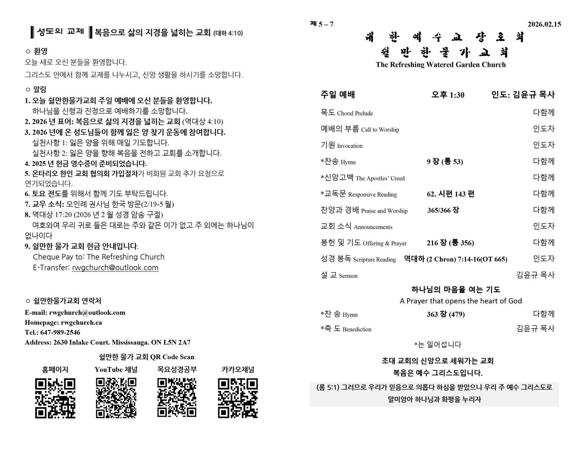 2026년 2월 15일 쉴만한물가교회 주보