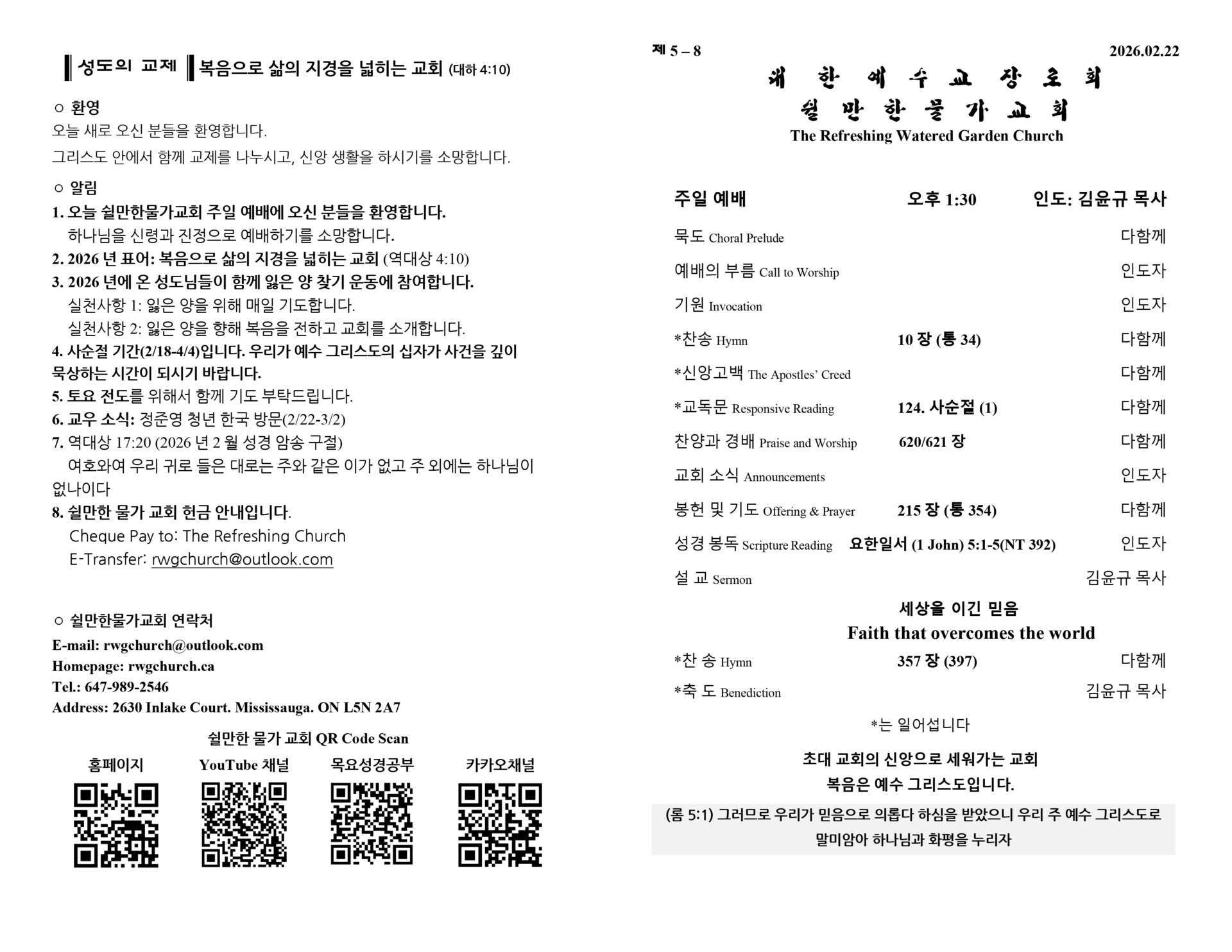 2026년 2월 22일 쉴만한물가교회 주보